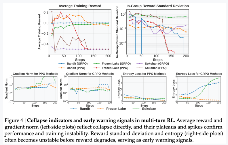 崩溃之前可以有早期指标预警。梯度范数峰值通常标志着不可逆崩溃的点,但是在早期指标,如奖励标准差和熵,调整策略使得实现稳定。