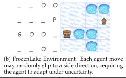 环境描述:智能体在冰面上导航到目标,但每次移动都可能滑向意外方向。测试智能体在随机环境中的适应能力。