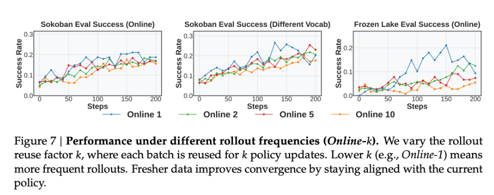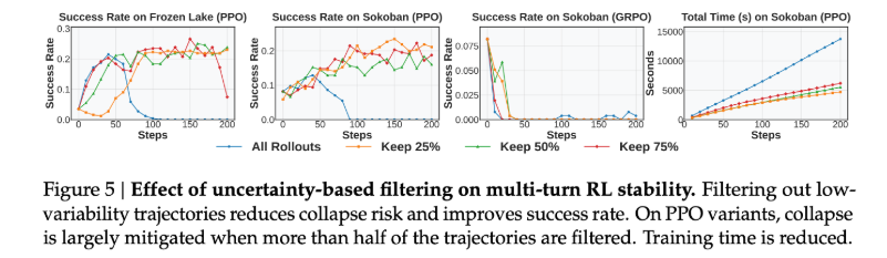 分析原因:推箱子 Sokoban 和冰湖游戏 的回答里都有比较多的重复内容,并且游戏涉及方位感知,不能充分利用预训练阶段的能力,故而会在 all rollout 情况下崩溃。而这种过滤,保留了高不确定性样本,强制模型探索新策略,从而延缓崩溃并提升成功率。