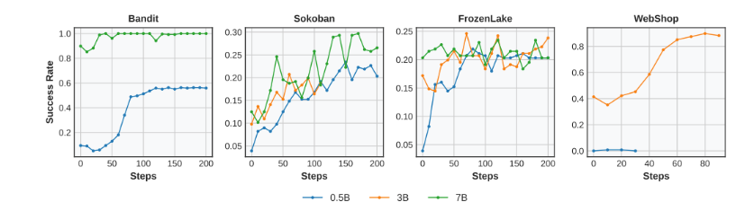 实验现象:更大的模型在 Bandit 和 WebShop 上有明显提升效果,但是在 Sokoban 和 FrozenLake 上有效果甚微