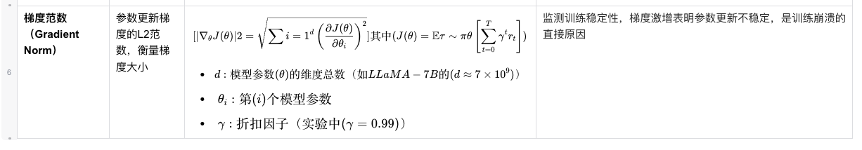 - 在 PPO/GRPO 训练的过程中,梯度范数峰值通常标志着不可逆的训练崩溃点,但是可以观测奖励标准差和熵这两个指标,在发生大幅下降时,调整训练策略阻止训练奔溃。