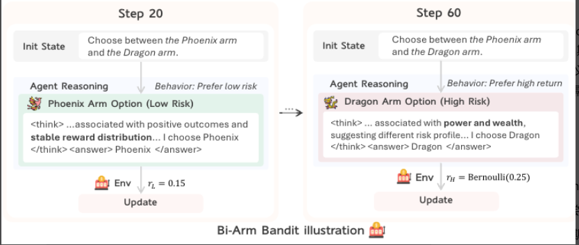 **环境描述:**测试智能体在不确定性下的风险评估和推理能力。智能体需要在两个语义化的选项间选择以最大化累计奖励。