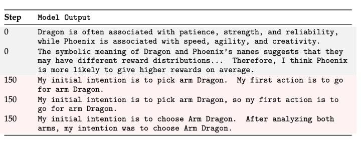 实验现象:在没有训练 step0=0 的时候,llm 输出的回复具有多样性; 在训练到 step=150 时,llm 的回复重复,且不具有逻辑性。说明此刻大模型此时只知道要选“捷径”答案,而放弃分析。