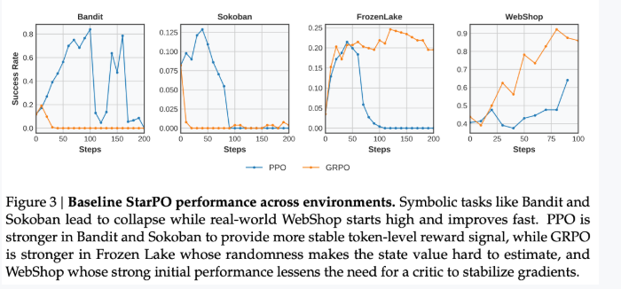 现象 3:Bandit,Sokoban,FrozenLake 训练失败,而 WebShop 训练成功
