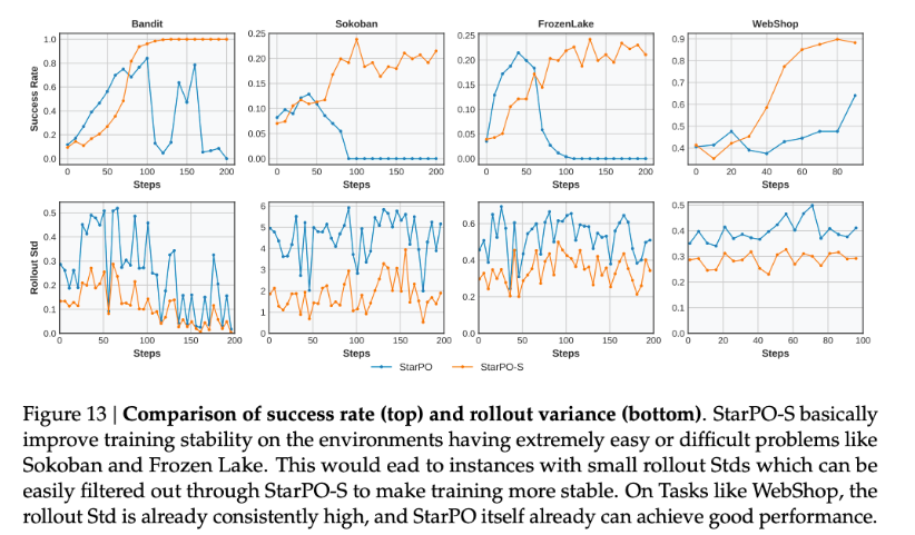 图例说明:StarPO-S 是采用过滤策略 25% 之后,第 2 行是过滤前后的方差对比,第 1 行是在 4 个游戏下的成功率。