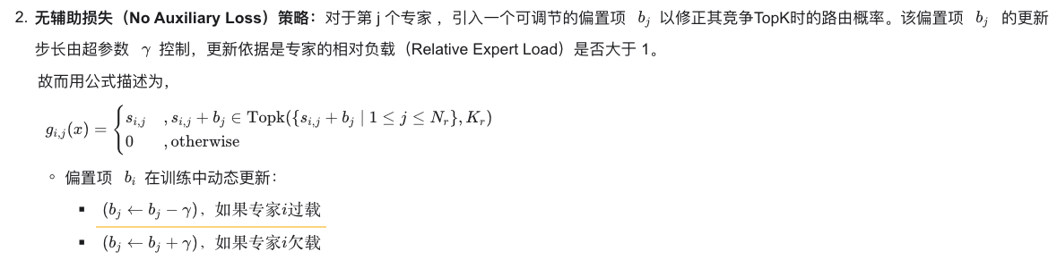 - 问题 2: 辅助损失可以降低负载不平衡问题,但是过大的辅助损失会损害模型性能,为了两者权衡,使用无辅助损失的负载均衡策略。
