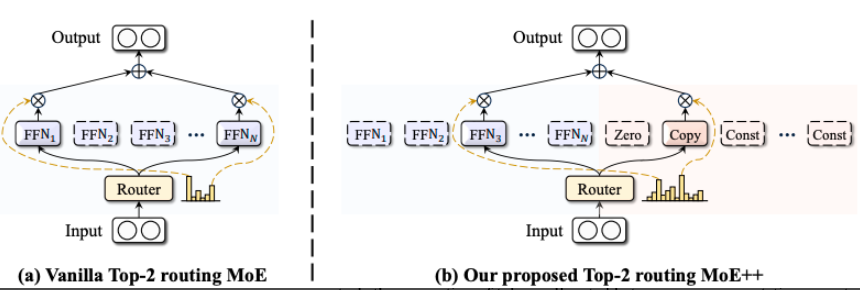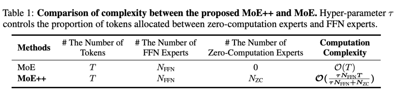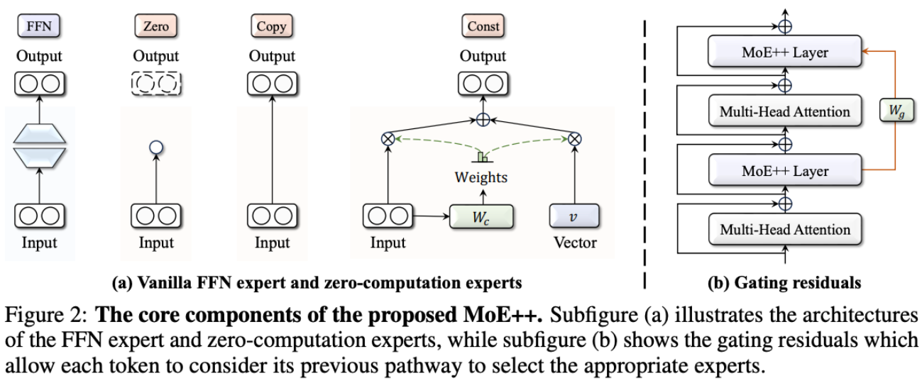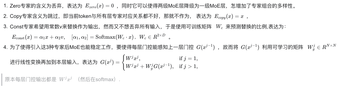 **方案:**对 MoE 中的专家类型做扩展,增加了 3 种类型的专家:(1)Zero 专家:专家输出始终为 0.(2)Copy 专家:专家输出等于专家输入 (3)Const 专家:专家输出包含常数项。同时为了能兼容这些类型,对门控机制做了修改,使得会受到上个门控的残差影响。 同时这样可以减少计算量。