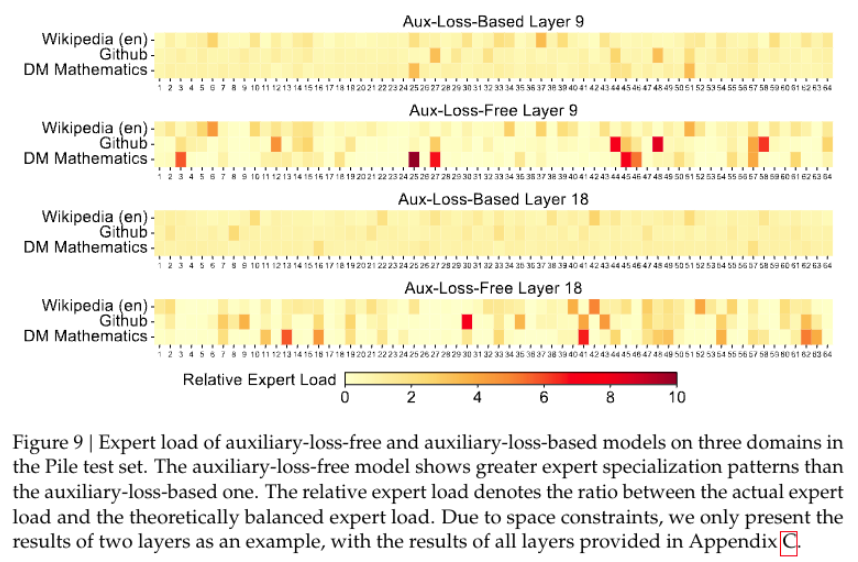 - DeepSeek-V3 提出的 Aux-loss-Free 使得不同领域的专家分布更有差异性,说明学习了专家专业化程度更高。