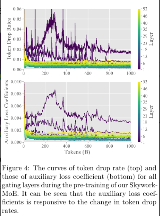 图例说明: 右侧色彩编码代表 52 个门控层,故而图中有 52 条曲线; 两个图的横轴都表示随着训练次数增加的 token 数; 上图的纵轴表示 token 丢弃率,下图的纵轴表示辅助损失系数;