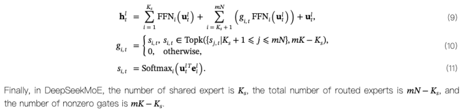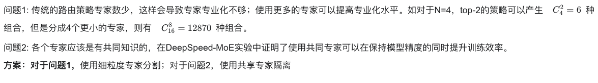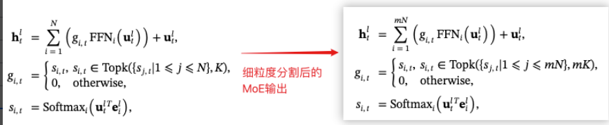 - **细粒度专家分割方法:**以往方法是 N 个专家里选择 k 个,而这个方法是把每个专家划分成更小 m 个更小的专家,然后从 mN 个专家里选择 mk 个。