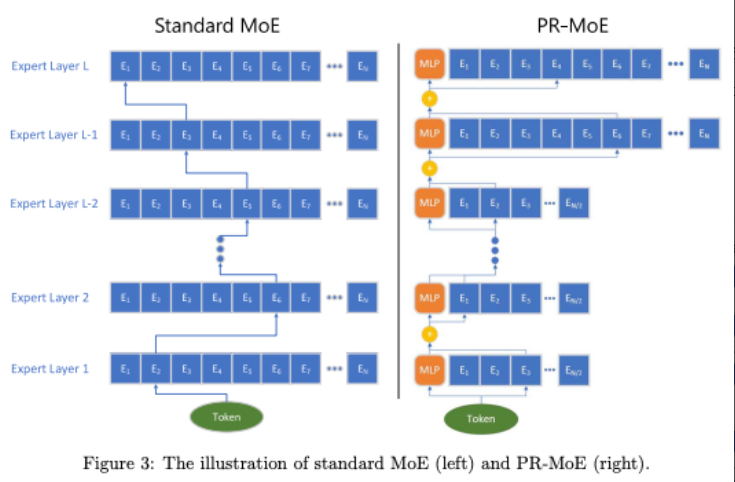 **方案:微软这个工作 **提出 PR-MoE 的结构,1️⃣ 该结构深层结构比低层模型专家数多,2️⃣ 且每个 token 都会都会通过 MLP 模块(共享专家)。