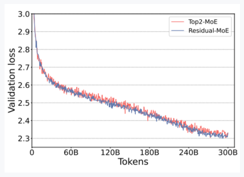 两者损失曲线几乎重合,表明 Residual-MoE 与 Top2-MoE 泛化能力相当。但因通信量减少,Residual-MoE 比 Top2-MoE 快 10% 以上。