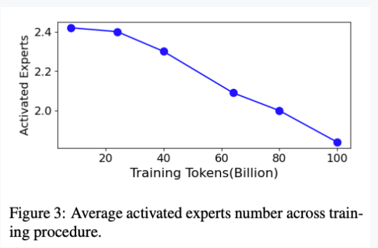 图例说明: 横轴:训练的 tokens 数量随着训练次数而增加 纵轴:平均激活的专家数 实验结果分析: Top-P 架构随着训练进行,激活专家数下降